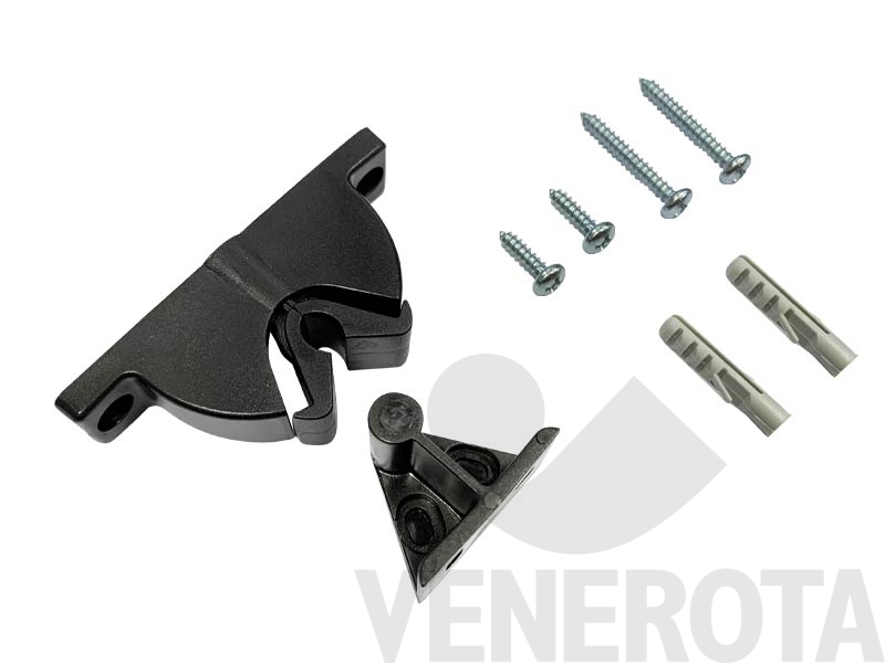 Incontro per fermaporta a pinza, progettato per garantire il bloccaggio del serramento in posizione di massima apertura e impedire il contatto diretto con la parete. Viti di fissaggio escluse.