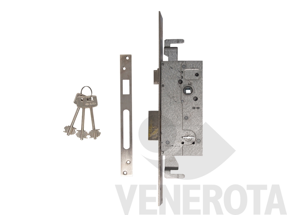 Serratura triplice ad incasso Cisa a doppia mappa, con 2 mandate, bordo quadro e frontale 25 mm. Dotata di scrocco piatto reversibile e catenaccio per una chiusura sicura.